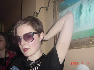 For those of you who have not heard "Fuck the Pain Away" by Peaches, I command you to download it at once. So damn good. They played it at this new fun night Lari discovered in the Georgia Straight. It's at a place called Unit 20 (an old legion hall, I think), it's on Saturday nights, and they have old-school punk, post-punk and goth, proto-rap, alternative and electroclash. It's a huge place with tons of seating and a small dance floor, there were more scene kids than I thought lived in Vancouver and I hardly recognized anyone. The place was packed. We would've stayed longer if it hadn't been so smoky. I was extra phlegm-y the next day. Bleah. Beforehand we went to the crepe place on Robson, and I had a crepe with spinach, cheese, and egg (my holy trilogy, or is that trinity). It made me yearn for France. I really really want to go to Paris. And then we sat in the car out in front of Unit 20 for about 15 minutes checking out who was going in and coming out. We were afraid it would be dead or there would just be creepy people there. When the situation checked out, we went in. For some reason the bouncer ID'd Larissa and not me. She's a month and a half older than me, so what was up with that?